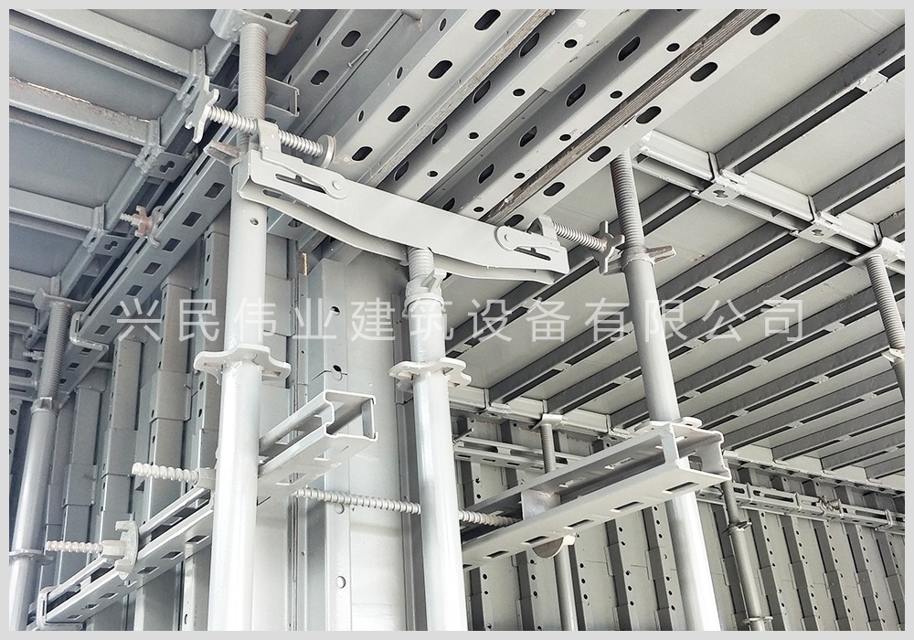 梁模板支護(hù)體系由豎梁、橫梁、穿墻釘、十字墊片、小螺母、組合而成。豎梁可以自由伸縮,
